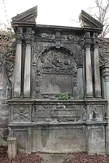 Symbolic carvings on the tomb of John Byres of Coates, Greyfriars Kirkyard