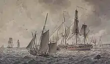 • HMS Royal George off Deptford at the launch of HMS Cambridge, 1755, (though the former ship was only launched a year later, and would have been of too deep a draught to appear where it does) (National Maritime Museum, London).