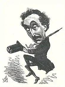 In 1876, D'Auban arranged the dances for the Gilbert and Frederic Clay comic opera Princess Toto, starring Kate Santley.[15] In 1877, D'Auban began working with Richard D'Oyly Carte, Gilbert and Arthur Sullivan by arranging the dances for their comic opera The Sorcerer.[16] In 1878, D'Auban trained Gilbert in his dances as Harlequin for the Harlequinade section of The Forty Thieves.[17] D'Auban arranged the dances for the next Gilbert and Sullivan opera, H.M.S. Pinafore, which became extraordinarily successful.[18] For the Christmas season in 1879, he choreographed the extravaganza burlesque of Gulliver's Travels by H. J. Byron at the Gaiety.[19]