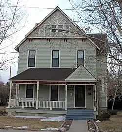 The two-story wood-frame Victorian style house is about 31 feet (9.4 m) wide and 45 feet (14 m) deep. It has three porches and detailing resembling half-timbering at the attic level. There are four main rooms downstairs and five bedrooms upstairs.[2]