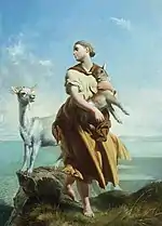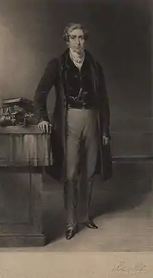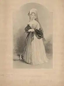 Francis was most successful as a figure and portrait painter. During his artistic career he completed a number of portraits of well known societal and political figures including Queen Victoria and Sir Robert Peel. Deffett's watercolour portrait of Queen Victoria (pictured on the right), displays the monarch with her dog, Dash, bounding by her side. The young monarch stands in a garden, elegantly attired in a bonnet and shawl. The painting was executed in 1837, the year that Queen Victoria assumed the throne, which may account for her youthful appearance. The painting was engraved and printed by Frederick Christian Lewis in 1838, a year after its original completion, and is still held in the Royal Collection.[6] Prints made after John Deffett Francis' figurative portrait paintings include: Madlle. Cerito: A Dancer (1858); Emma Romer, lithograph (n.d.); Fanny Cerito (1846); W.C. Macready (n.d.); Major General Sir William Nott, (1845); Captain Bowen Davies (1844) and Robert Peel (1841), and form part of the bequest made to the British Museum.[7]