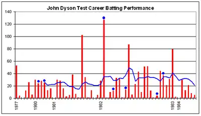 Dyson made 53 runs in the first innings, taking part in a crucial partnership of 84 with Bob Simpson.[15] He made 4 in the second but those first innings runs proved especially valuable in a narrow Australian victory.[16]