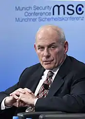 Kelly was selected as the first Secretary of Homeland Security in the Trump administration. Kelly earned a reputation for being an aggressive enforcer of immigration law. After six months, he was selected to replace Reince Priebus as White House Chief of Staff in an attempt to bring more stability to the White House.[2] He was the first career military officer to serve in the position since Alexander Haig during the Nixon and Ford Administrations.[3]