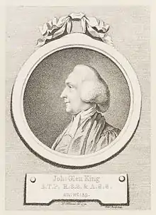 King became a Fellow of the Society of Antiquaries of London on 10 January 1771, and then on 21 February that year was elected a Fellow of the Royal Society. He was incorporated M.A. at Oxford, on 19 March 1771, as a member of Christ Church, Oxford, and four days later took Oxford degrees of B.D. and D.D. He was presented to the rectory of Wormley, Hertfordshire, by Sir Abraham Hume, 2nd Baronet, in July 1783. In 1786 he purchased the chapel in Spring Gardens, London, and John Warner's chapel in Drury Lane, London.[1][2][3]