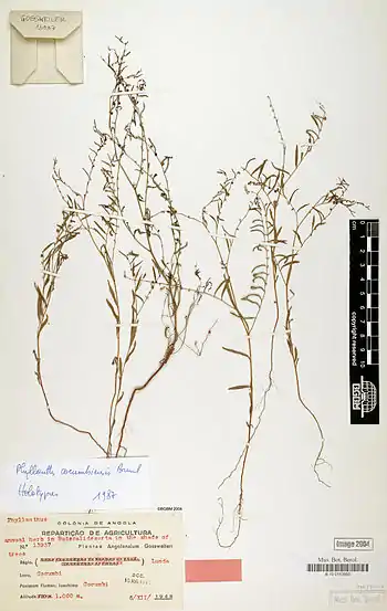 Phyllanthus cocumbiensis, Jean F. Brunel. Holotype at Herbarium Berolinense. Collected by John Gossweiler, 6 December 1946 at Cocumbi, Luanda, Angola. Leg.: J. Gossweiler 13937 (BD)