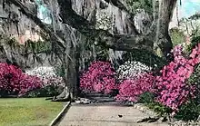Drayton's focus now became rebuilding Magnolia's deteriorating gardens and postponing his ordination. He chose a garden format popular in the mid-nineteenth century called the Romantic style, a natural, informal approach to design and plantings. Drayton's "picturesque" style of Romanticism, "expressed by striking, irregular spirited forms", was a stark contrast to the formal, geometric style of nearby Middleton Place and a naturalistic expression at Drayton Hall, where "man exert[ed] control over the natural environment."[19] Drayton's Magnolia became an innovative showcase for unbridled natural beauty, "which allowed man and nature to co-exist. Wildness was glorified and enhanced, not tamed."[20] In the 1840s Drayton was one of the first people in the United States to plant Camellia japonica (Japanese camellia) outdoors on a large-scale and grow Azalea Indica (Indian azalea) outdoors.[21][22] His vision and genius turned Magnolia Plantation and Gardens into one of the world's most impressive, cultivated landscapes.[23][24]