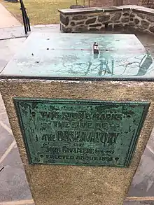 A plaque commemorating the location of the Gummere Observatory on the Haverford Campus. It reads "This stone marks the site of the Observatory of John Gummere (1784-1845). Erected about 1834."