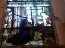 Bottom-left scene of Harrison Memorial Window, St John's Church, Leeds, UK. John Harrison gives a tankard of coins to the imprisoned King Charles I. Painted in 1885 by Burlison and Grylls.