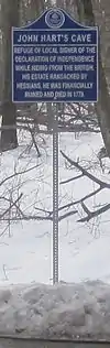 Historical marker for John Hart's cave in East Amwell Township, New Jersey.