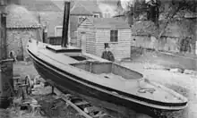 The first ship built by Thornycrofts for the Royal Navy at the Woolston Yard was the Tribal-class destroyer HMS Tartar. Up to the start of World War I, the yard built 37 destroyers for the Royal Navy and several more for other navies. During the war, the yard made 26 destroyers, 3 submarines and a large number of smaller craft for the Royal Navy.[9] Notable among the smaller craft were the Coastal Motor Boats (built at Hampton – see below), based on a design by John Thornycroft (the elder) who continued working with hull designs at his home on the Isle of Wight until his death in 1928, taking out his last patent in 1924.[10] His daughter, naval architect Blanche Thornycroft worked alongside him (and after his death) testing models, calculating and recording results.[11]