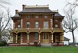 The John K. Voorhees House is a historic building located northwest of Oskaloosa, Iowa, United States. A native of Warren County, Ohio, Voorhees settled in Mahaska County in 1853. He owned 400 acres (160 ha), and was considered a leading farmer in the county.[2] He was known for his horses and Black Angus cattle. Voorhees had this house built in 1871, and he supervised the work that was done by masons and carpenters. It is a combination of the Italianate and Second Empire styles. The 2½-story, brick structure follows a T-plan. It features a mansard roof, bracketed eaves, limestone quoins on the front, brick quoins on the back, and a full sized wrap-around front porch. The east section of the original porch and the balustrades on top had been removed.[2] They have subsequently been recreated. The house was listed on the National Register of Historic Places in 1982.[1]