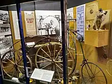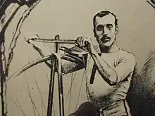 In the spring of 1876 John Keen travelled to New York with his bicycle.[4] By 1878 he was internationally reputed to be the fastest rider in the world, the professional champion of England [5] and his name appeared on advertisements (in 1879) for the Columbia bicycle manufactured in the USA which stated his achievement of 1 mile in 2 minutes and 43 seconds (22 mph).