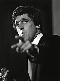 Kerry won the nomination with 325,890 votes (29%) to Murphy's 286,378 (25.48%), Rotondi's 228,086 (20.29%), Nickinello's 150,829 (13.42%) and Pines' 132,734 (11.81%).[86] In the concurrent gubernatorial primary, former Governor Michael Dukakis defeated O'Neill and incumbent Governor Edward J. King.[87] The Dukakis and Kerry ticket defeated the Republican ticket of John W. Sears and Leon Lombardi in the general election by 1,219,109 votes (61.92%) to 749,679 (38.08%).[88][89]