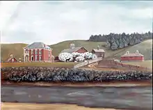The oil portrait to the left was commissioned in about 1880 from the original black-and-white photo and illustrates the original color scheme of the home and out buildings.