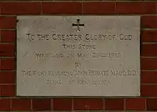 A foundation stone laid by John Maud in 1912 at St Hilda's parish church, Ashford, Middlesex (now Surrey)