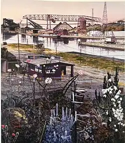 Moore has painted industrial sites—in Pennsylvania, Boston, St. Louis and Maine—for nearly four decades.[27][16][1] Critics have characterized his industrial images as existing "in an unfixed present" encompassing several places, times and moods at once.[42][6] In the 1980s, he first visited Coatesville, Pennsylvania, the location of the steel mills that Precisionists Ralston Crawford and Charles Demuth had portrayed.[15][42] Moore's Coatesville paintings (Near Lincoln Highway, Coatesville, 1988; Coatesville, 1986–9) were reconsiderations of the site from a subtly critical, post-industrial vantage point that weighed utopian promises against a present haunted by the decline of American manufacturing.[27][1] His images both celebrate structures such as smokestacks and factories and serve as elegies for the industrial past;[52][41][15] unlike the pristine Precisionist images, they show wear—peeling paint, smudged windows, aging metal, neglected brick walls, spaces absent machinery—and a concern for integrating the sites into their social fabric.[16][42][1]
