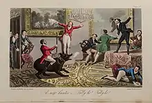 Meanwhile, he indulged his enjoyment of horseracing and gambling, and enjoyed some success at both. He bought a horse named Euphrates, which was already a consistent winner, and entered it in the Gold Cup at Lichfield in 1825, and it duly won. Its portrait, commissioned by Mytton from the painter William Webb, was exhibited at the Royal Academy the same year. Mytton also became a well-known character at Oswestry Race Course, an increasingly disreputable local racetrack.[12]
