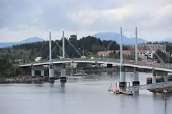 The John O'Connell Bridge is a cable-stayed bridge over the Sitka Channel located in Sitka, Alaska. The bridge connects the town of Sitka on Baranof Island to the airport and Coast Guard Station on Japonski Island. Until the bridge was completed in 1971, the commute was only achievable through a ferry service. The bridge is named after John W. O'Connell, a former mayor of Sitka.[2] The two-lane bridge is 1,255 feet (383 m) in total length, with a main span of 450 feet (140 m).[3] The bridge was also the United States' first vehicular cable-stayed girder spanned bridge.[4] The four 100-foot-high (30 m) steel pylons carry two three-cable sets, each carrying a section of the bridge deck.[5][6] Special consideration was given to the bridge's aesthetics due to its proximity to nearby Castle Hill.[2]