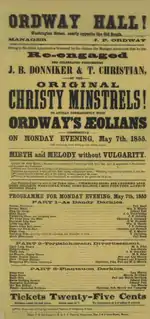 Ordway ws born in Salem, Massachusetts. In the mid-1840s John Ordway and his father Aaron opened a music store in Boston. John was also a music publisher and composer; his song Twinkling Stars are Laughing, Love (1855) was recorded by the Hayden Quartet as late as 1904. Around 1845 he organized Ordway's Aeolians, a blackface minstrel troupe[2] which performed at Ordway Hall in Boston and also nationally to promote Ordway's publishing business.[3][4] Future bandleader/composer Patrick Gilmore worked in Ordway's store and also appeared with the Aeolians. James Lord Pierpont's first major composition "The Returned Californian" in 1852 was written expressly for Ordway and his troupe. A number of 19th century songs were written for the Aeolians and/or dedicated to Ordway, including Jingle Bells.[5][6][7]