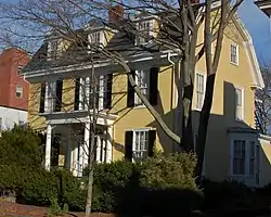 The John P. Peabody House is a historic house at 15 Summer Street in Salem, Massachusetts. Built in 1868 by Salem merchant John P. Peabody, it is a rare early example of Colonial Revival architecture. The two story wood-frame house is three bays wide, with a slate gambrel roof. The centered front door is sheltered by a portico supported by Doric columns. The second story center window reinforces focus, being enlarged slightly by sidelights as compared to the other windows on the facade. The roof is pierced by three dormers, the outer ones with pointed gables and the central one with a rounded pediment reminiscent of the then-fashionable Second Empire style.[2]