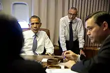 President Obama holds a meeting with John Podesta and Susan Rice aboard Air Force One, 2015