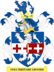 Out of a ducal coronet Or charged with a cross humetee Azure a demi-lion rampant of the last.