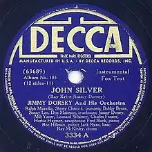 Jimmy Dorsey and His Orchestra recorded "John Silver" on April 29, 1938, and released the song as a Decca 78, 3334A, Matrix # 63689, with Bob Eberly on vocals.[1] The single reached no. 13 on Billboard in 1938, staying on the charts for 2 weeks.[2]