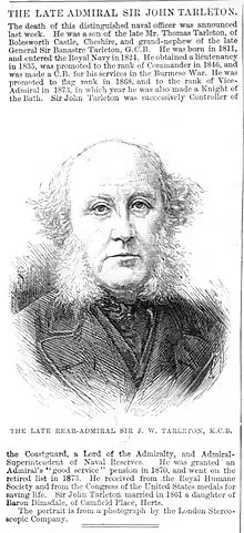 Admiral Sir John Walter Tarleton, KCB (8 November 1811 – 25 September 1880) was a Royal Navy officer who went on to be Second Naval Lord.