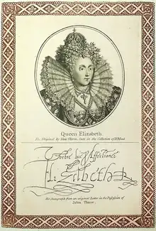 Portrait of Elizabeth I, after Isaac Oliver, with the queen's signature, from British Autography