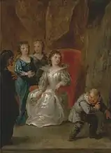 Vertue notes that Vanderbank ‘livd very extravagantly a mistres drinking & country house a purpose for her’.[36] This extravagance led him into debt and in 1724 Vanderbank fled to France briefly to avoid imprisonment by his creditors,[37] returning to enter 'the liberties of the Fleet', mansion houses near the Fleet prison in which privileged prisoners could enjoy relative comfort in return for payment.[2] In 1727 Vanderbank's mother died, having prudently left her assets out of reach of John's creditors to her younger son Moses, and in 1729 Moses sold a share in the family tapestry business to the painter John Ellys to settle John Vanderbank's debts. Vanderbank then accepted a free residence in Lord Carteret's house in Holles Street, neighbouring the Duke of Chandos's house in Cavendish Square, London.[8]