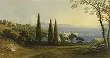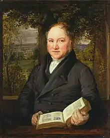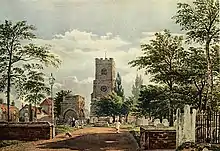 John Varley was born at the Old Blue Post Tavern, Hackney, on 17 August 1778. His father, Richard Varley, born at Epworth in Lincolnshire, had settled in London after the death of his first wife in Yorkshire. His mother was an alleged descendant of the regicide Oliver Cromwell through the marriage of his daughter, Bridget, and the Parliamentarian soldier and politician General Charles Fleetwood. Varley's parents discouraged his leanings towards art, and placed him under a silversmith.[1] But on their death he was for a brief time employed by a portrait painter in Holborn and then, at the age of 15 or 16, he became a pupil of Joseph Charles Barrow (fl. 1789–1802) who had an evening drawing school twice a week at 12 Furnival's Inn Court, Holborn. It was Barrow who took Varley on a sketching tour to Peterborough from which he emerged as a professional painter. In 1798 he exhibited a highly regarded sketch of Peterborough Cathedral at the Royal Academy and became a regular exhibitor at the RA until the foundation of the Old Watercolour Society in 1805.[1]