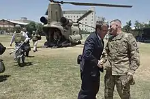 Nicholson was the longest-serving commander of the War in Afghanistan, having led the 41-nation NATO-led Resolute Support Mission and United States Forces-Afghanistan for two and a half years from March 2016 to September 2018.[12][13][14] Nicholson told the Senate Armed Services Committee in 2016 that "Since 9/11, the U.S. campaign in Afghanistan has largely defined my service."[15][16] He assumed command from General John F. Campbell on March 2, 2016.[17] Nicholson was given command of the Resolute Support Mission in Afghanistan, amid a worsening security situation.[18][19][20][21] Nicholson apologized in person for U.S. involvement in the Kunduz hospital airstrike.[22][23]