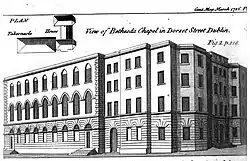From this time the Chapel took on a more Calvinist tone, and encountered hostility from the Church of Ireland hierarchy.[11] It drew in Trinity College students, and so recruited the evangelical ranks, and the congregation was influential.[12] Arthur Guinness II, an evangelical Christian, was one of them. In 1798 Maturin took the living of Clondavaddog, after the murder there the previous year of the incumbent William Hamilton, and Walker became the sole chaplain.[13][14][15]