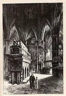 Upon his death, Waltham had wished to be buried within Salisbury Cathedral, but the king intervened and ordered that Waltham should be given a tomb in Westminster Abbey, London.[24] He sent Sir William Scrope to claim the body from Salisbury, and Waltham's remains were brought to London to be buried in the Chapel of Edward the Confessor, the only person not of royal blood to be buried in the royal chapel.[9] The decision to grant to a commoner a grave amongst the Kings of England caused controversy, and in an attempt to appease detractors, Richard made a gift to the Abbey of a large sum of money and two copes.[6] Saul notes that Richard had made similar interventions in the burial of other supporters and friends, including those of John Hawkwood and Archbishop Courtenay, suggesting that his "finely honed sense of the theatrical possibilities of burial" was a strategy to project an image of power.[25] After Richard's downfall and death, he was buried in All Saints, King's Langley in 1400, but later re-entombed in Edward the Confessor's Chapel in Westminster Abbey in 1413.