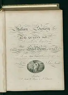 Other books illustrated with engravings after works by Smith include Select Views in Italy (1792–6); Views of the Lakes of Cumberland, with twenty aquatints by James Merigot (1791–5); William Byrne's Britannia Depicta and William Sotheby's Tour through Wales (1794).[2] This last book was subtitled "Odes and other Poems. With Engravings from Drawings taken on the Spot by J. Smith". In the preface, Sotheby wrote "the author of the following Poems thinks proper to signify, that the present edition is published solely for the emolument of the artist, who has stamped a value on the descriptive parts of the Welsh Tour, by the embellishments of his accurate and masterly pencil". The plates were etched in aquatint by Samuel Alken.[7]