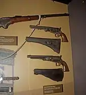 After spending time at the saloon during intermission, Booth entered Ford's Theater one last time at 10:10 pm. In the theater, he slipped into Lincoln's box at around 10:14 p.m. as the play progressed and shot the President in the back of the head with a .41 caliber Deringer pistol.[105] Booth's escape was almost thwarted by Major Henry Rathbone, who was in the presidential box with Mary Todd Lincoln.[106] Booth stabbed Rathbone when the startled officer lunged at him.[82] Rathbone's fiancée Clara Harris was also in the box but was not harmed.
