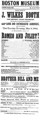 On November 25, 1864, Booth performed for the only time with his brothers Edwin and Junius in a single engagement production of Julius Caesar at the Winter Garden Theatre in New York.[56] He played Mark Antony and his brother Edwin had the larger role of Brutus in a performance acclaimed as "the greatest theatrical event in New York history."[55] The proceeds went towards a statue of William Shakespeare for Central Park, which still stands today (2019).[56][57] In January 1865, he acted in Shakespeare's Romeo and Juliet in Washington, again garnering rave reviews. The National Intelligencer called Booth's Romeo "the most satisfactory of all renderings of that fine character," especially praising the death scene.[58] Booth made the final appearance of his acting career at Ford's on March 18, 1865, when he again played Duke Pescara in The Apostate.[59][60]