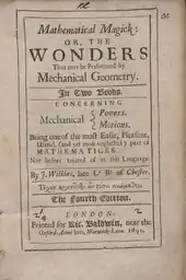The early scientific works were in a popular vein, and have links to the publications of Francis Godwin. The Discovery of a World in the Moone (1638) was followed up by A Discourse Concerning a New Planet (1640). The author highlights the similarities between the Earth and the Moon. Based on these similarities, he proposes the idea that the Moon would house living beings, the Selenites.[27] [28] Godwin's The Man in the Moone was also published in 1638. In 1641 Wilkins published an anonymous treatise entitled Mercury, or The Secret and Swift Messenger.[29] This was a small work on cryptography; it may well have been influenced by Godwin's Nuncius inanimatus (1629).[30][31] His Mathematical Magic (1648) was divided into two sections, one on traditional mechanical devices such as the lever, and the other, more speculative, on machines. It drew on many authors, both classical writers and moderns such as Guidobaldo del Monte and Marin Mersenne.[32] It alludes to Godwin's The Man in the Moone, for bird-powered flight.[33] These were light if learned works and admitted both blue-sky thinking, such as the possibility of the Moon being inhabitable, and references to figures on the "occult" side: Trithemius, John Dee, the Rosicrucians, Robert Fludd.[34][35]