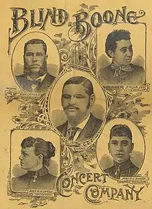 Boone's mother, Rachel Boone Hendricks (when she married Harrison Hendricks in 1871, she used the Boone surname),[2] worried that her son would find life too difficult without some sort of education. Because of this, his hometown of Warrensburg decided to make sure that Boone received an education and paid for him to attend the Missouri School for the Blind where he played the piano for first time. After growing bored with his experience there (they tried to teach him to make brooms), Boone's habitual rule breaking (sneaking off at night to listen to piano music at the local barrooms) got him expelled. He returned to Warrensburg where he began to wander, playing with local musicians. He was actually kidnapped for a time by a gambler and sometime showman, Mark Cromwell, until his step-father, Harrison Hendricks caught up with them in Mexico, Missouri. In 1879, Boone was "discovered" by Columbia, Missouri contractor, John B. Lange, Jr., who put Boone on the road, as Blind John. Only meager financial success was attained until Boone was boarded for two months at the home of George Sampson in Iowa. Mrs. Sampson was an accomplished pianist herself and taught Boone how to properly play the great European masters. It is said she taught him not only their minds, but their hearts as well. Upon his return to Iowa, Lange found his young protege had acquired much new skill, and with the addition of a vocalist, began billing as the Blind Boone Concert Company. The Company worked hard, traveling from town to town on a whistle-stop like tour. They began to acquire fame and fortune, returning to Columbia in 1887 with a large sum of money to deposit in their bank account. By the new century, they are among the most popular acts in the country, playing 300-plus dates annually. John Lange died in Kansas City in 1916. In 1889, Boone had married John Lange's daughter, Eugenia Lange. Boone continued on, touring the eastern US in 1919, spending an entire month in New York city. Upon announcing his retirement from touring in 1924, Boone was described by a Kansas City newspaper as having, "combined talent with hard work to make life worth living." Due to financial difficulties brought on by a less than adequate manager, Boone continued to play concerts until the spring of 1927. He died of acute dilation of the heart on October 4, 1927, in Warrensburg. He was buried at the Columbia Cemetery.[3] "Blind Boone, His Early Life and Achievements," Mrs. Melissa Fuell-Cuther, B.S.D., Evangel Pub. Society, Robbins, Tennessee, 1918.