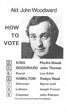 Woodward was an alderman from the Kirribilli ward of the North Sydney Council from 1965 to 1974, Deputy Mayor from December 1968 to December 1970, and Mayor of North Sydney from September 1971 to September 1972.[7][8] During his time with North Sydney Council, Woodward advocated protecting local heritage, reducing housing density and loss of trees, and establishing community services.[9]