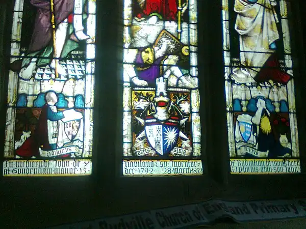 John de Havilland's coat of arms can also be seen at St Peter's Church at Langford Budville (near Wellington) in the County of Somerset, England. They are set in a stained glass window there. His father - John Haviland - has his coat of arms on the left. His mother - Mary von Sonntag - has her coat of arms are on the right. It can be seen in the photograph below that John de Havilland's coat of arms is a combination of the parental coats of arms......