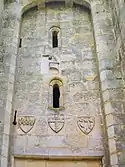 Gatehouse of Bodiam Castle with three coat of arms inset. The one on the right is that of John de Radynden