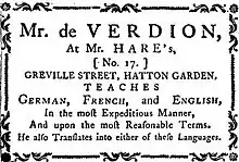 De Verdion taught languages to various prominent men. He taught German to Edward Gibbon, who went on to author The History of the Decline and Fall of the Roman Empire.[8] He also taught English to the Prussian ambassador and German to William Cavendish-Bentinck, 3rd Duke of Portland.[2] De Verdion was an admirer of John Wesley.[9][10]