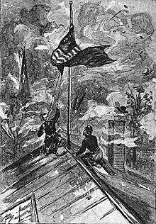 Upon his return, he joined the staff of Brigadier General George F. Shepley, commanding the military district of Norfolk.[9] When General Shepley was assigned as Chief of Staff to the XXV Corps commanded by Major General Godfrey Weitzel, de Peyster became an aide to Weitzel, and eventually his chief of staff.[9] The unit de Peyster had originally joined, the 13th New York, was also assigned in the XXV Corps. He is credited with raising the first Union flag over the Confederate capitol of Richmond, Virginia, after its fall.[lower-alpha 1][11][12][13][14] The flag was the same one that had been raised over the city of New Orleans, Louisiana, after its fall.[15] Shepley had been the military Governor of New Orleans, and later the State of Louisiana while it flew there.[6]