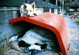 Artforum called Peterson's approach to exhibition, ownership and financing iconoclastic; he exhibited unused structures that were not for sale, models for proposed shelters, and clinically shot, for-sale photographic editions documenting the installation, occupation and use of prior shelters in order to finance the work.[15] However, as Constance Mallinson wrote, ultimate ownership was, “dictated entirely by the ecology of the street—with no attempts at upkeep or replacement—their impermanence underscoring the fragility of life and dystopian dimensions of modern cities."[16] When politicians began considering the shelters as potential solutions to the homeless issue rather than provocations questioning the social order, Peterson decided the work had run its course.[14][16]