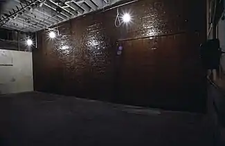 Peterson began as a painter, creating translucent, abstract, grid-based works on large sheets of vellum, as well as site-specific work spray-painted directly on gallery walls.[15][29][30][31] His "Negentropic Spaces" series (1976) used layered vellum sheets with strings and paint sandwiched between; they alternated between flatness and illusionism and recalled the graphs and structural plans of his engineering background.[31][14][32] His "Wall Paintings" (1978–82) were dark, atmospheric and mysterious, like backgrounds of Old Masters paintings with affinities to the art of Barnett Newman and Mark Rothko.[16] This work subverted notions of the art object by eschewing foregrounds and embracing a fluid relationship dependent on chance and improvisation, in which what happened in front of the piece became its subject.[30][14][16] Concurrent to his painting, Peterson created lattice- or airframe-like, brightly-colored wood-and-wax sculptures that were architecturally inspired and echoed the grid paintings.[2][14] Critics suggest that as their scale increased to human proportions, the geometric, cage-like structures suggested absent bodies and enclosure, presaging his "Bum Shelters", as did the wall paintings' blurring of subject and object.[15][2]