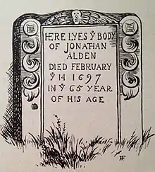 Jonathan Alden died on February 14, 1697, in Duxbury, leaving an estate of £309 (about US$67,500 in 2022).[18][19] He was given a military funeral and "buried under arms." He was interred near his parents in Myles Standish Burial Ground, the oldest maintained cemetery in the United States.[20][21]