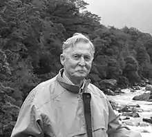 White was interested in botany, ornithology and tramping, and his paintings reflect his personal love of remote places, wilderness areas and New Zealand's landscape.[7][8] He had an interest in conservation work and became an honorary ranger for Fiordland and Te Urewera National Parks. He was also a life member of the Royal Forest and Bird Protection Society of New Zealand, the World Wide Fund for Nature, and the QEII National Trust.[9] In 1990, he was commissioned to create a collection of paintings for the national parks centennial.[9] White's style could be classed as realism and representational of the scenes he was capturing.[10]