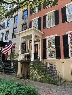 7 East Jones Street | 1851 | Built by John Scudder for a Miss Cornelia Millen, the building was later purchased by William Davidson, a liquor merchant and an officer with the Chatham Artillery;[10] stoop replaced in 1908 |