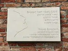 Brodsky died of a heart attack aged 55, at his apartment in Brooklyn Heights, a neighborhood of Brooklyn, a borough of New York City, on 28 January 1996.[12] He had had open-heart surgery in 1979 and later two bypass operations, remaining in frail health following that time. He was buried in a non-Catholic section of the San Michele cemetery in Venice, Italy, also the resting place of Ezra Pound and Igor Stravinsky.[12] In 1997, a plaque was placed on his former house in St. Petersburg, with his portrait in relief and the words "In this house from 1940 to 1972 lived the great Russian poet, Iosif Aleksandrovich Brodsky".[31] Brodsky's close friend, the Nobel laureate Derek Walcott, memorialized him in his collection The Prodigal, in 2004.